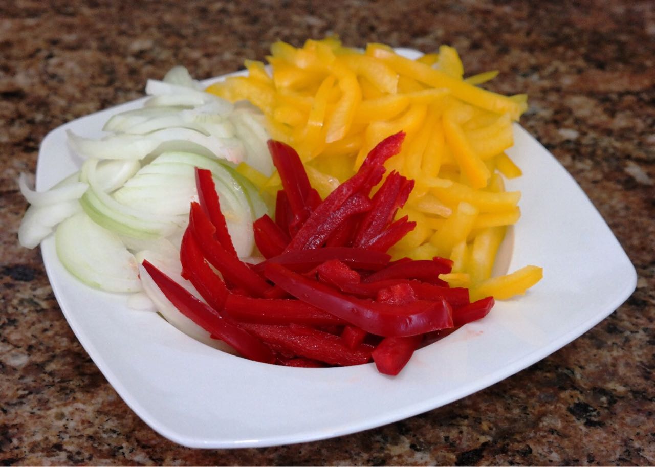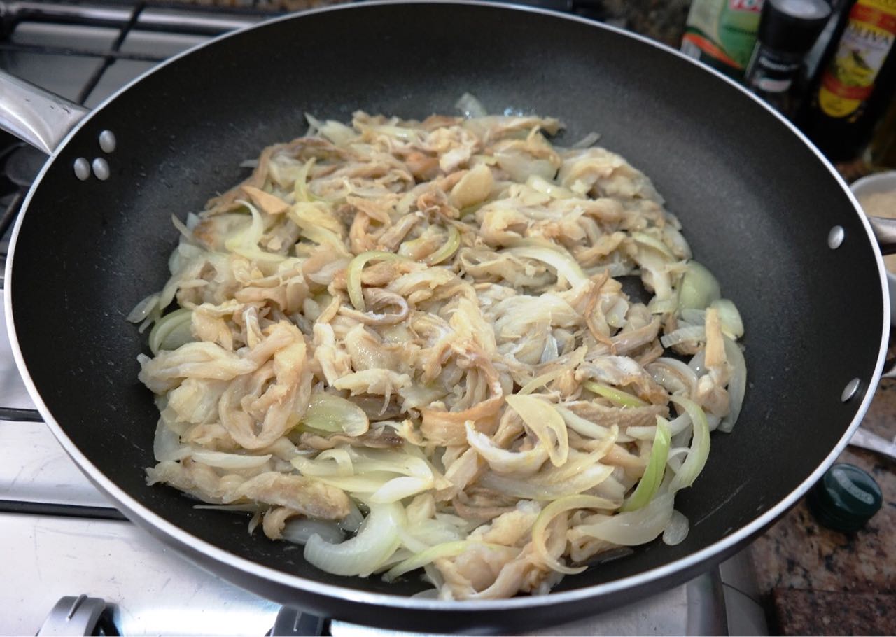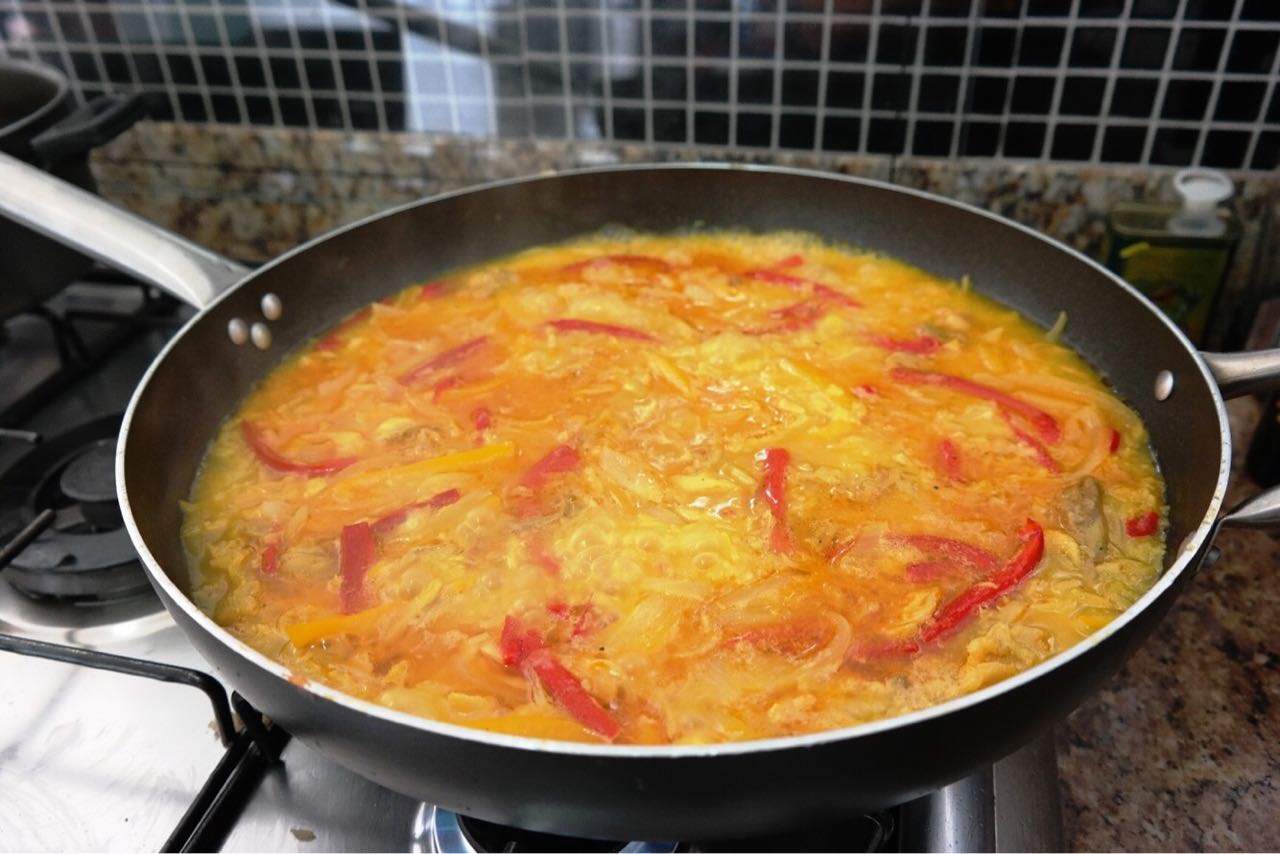 1- Corte a Cebola e os Pimentões em tiras. Corte o Alho em pequenos pedaços. Desfie o Bacalhau em lascas grandes. Coloque o caldo de legumes com o tempero Paellero e ferva, formando um caldo avermelhado.