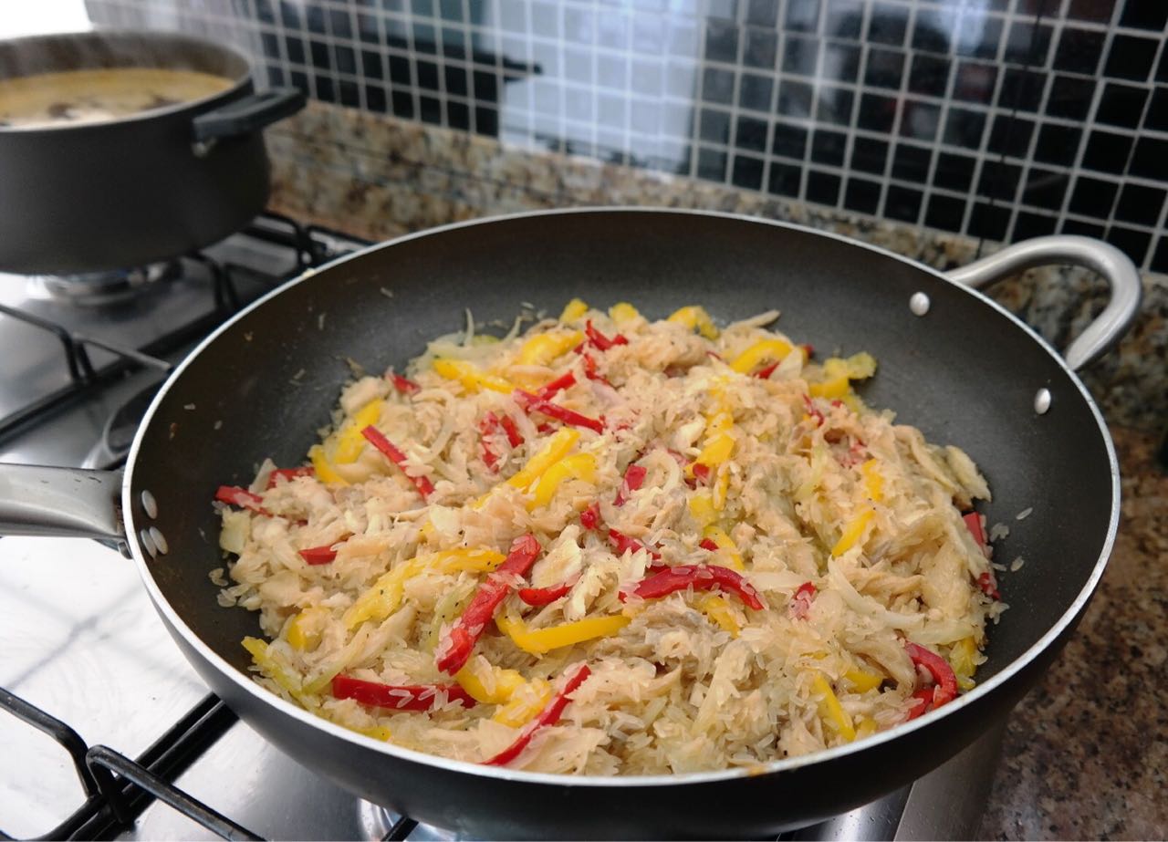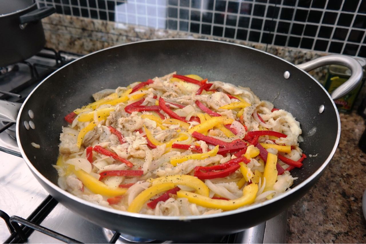 2- Na frigideira, doure a Cebola e o Alho no Azeite. Acrescente o Bacalhau e refogue-o por 5 minutos. Coloque metade das tiras de Pimentão amarelo e vermelho e cozinhe por mais 5 minutos. Agregue um pouco da Pimenta do Reino e Sal, se precisar.