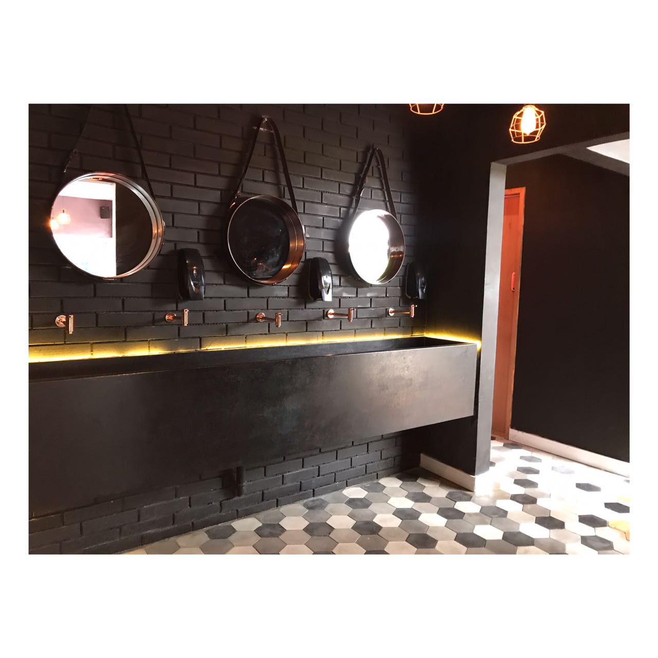 A fachada chama atenção. Na entrada, um painel de aço com um letreiro luminoso e uma varandinha convidativa. Quem passa na frente, não imagina que lá dentro é ainda mais bonito. Parede de tijolinho, elementos rústicos e modernos na decoração, varal de luz, projeção na parede, um bar charmoso e um banheiro lindo. É gente… sou a ‘lôca’ dos banheiros e em todos os lugares do mundo que vou, confiro o WC. Quando fico impressionada, relato aqui no blog, e o da Astoria é lindo!